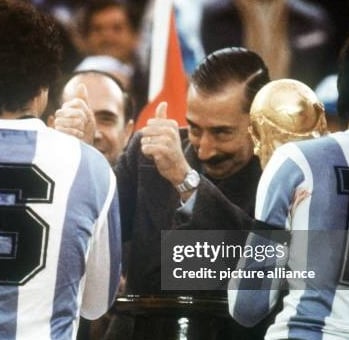 But the reason for Menotti’s ambivalence was that “[o]n the pitch, Argentina’s leader General Jorge Videla, grinning beneath his moustache, oiled hair gleaming in the floodlights, presented the World Cup trophy to …Argentina’s captain. As [he] raised it to a roar of celebratory patriotism, Videla turned to one side and raised both his thumbs in glee.”* For all of Menotti’s on-field politics and style, the cold hard facts were that the World Cup win was an invaluable, peerless PR win for General Videla’s ruthless junta which had ruled Argentina since 1976. The junta was most notorious for their brutal ‘dirty war’, which referred to the deaths of at least 30,000 people, many of whom had disappeared for years. Even during the leadup to the World Cup and the event itself, protestors had thronged the major cities, but as the team kept winning, their glory drowned out all other noise.
