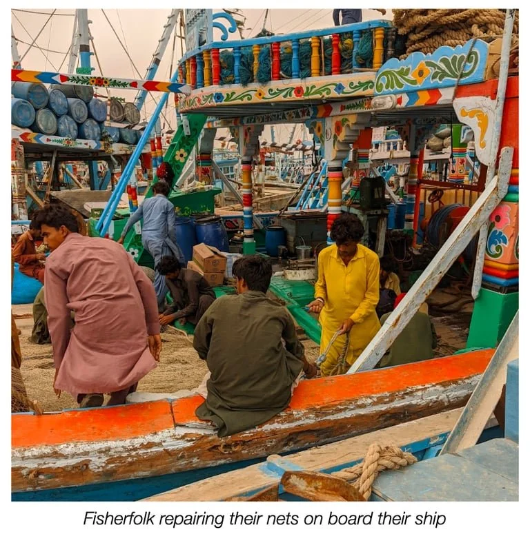 Similarly, many social traditions in the region celebrate seafaring life. For instance, When a new boat is about to make its maiden voyage, relatives and well-wishers garland the owner with flowers. They tie “ajraks” (clothes adorned with a block-printing style traced back to the Indus Valley civilization, central to Sindhi heritage) and colorful dupattas (traditional shawl-like scarfs) to the boat, and distribute dates amongst each other. The boats and launches are also elaborately decorated for Eid. During Ramadan, fisherfolk mosques would raise flags which were taken down when it was time to open the fast, after which large communal feasts would be served.